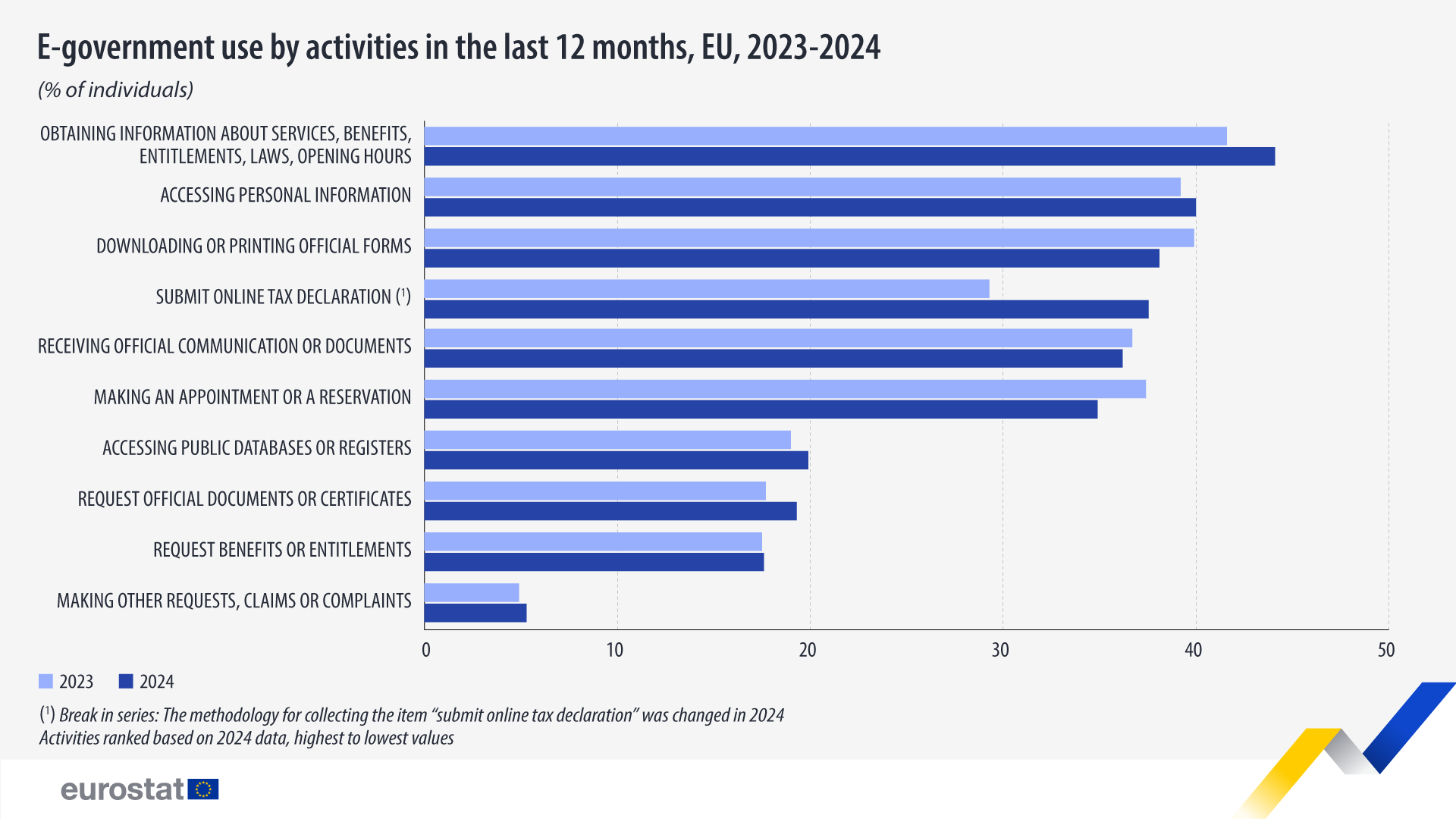 The most frequent use of e-government services was obtaining information about public services, benefits, laws, and administrative details, with 44.0% of EU citizens engaging in this activity, an increase of 2.4 percentage points from the previous year. Accessing personal information was the second most common service, used by 40.0% of individuals, reflecting a 0.8 percentage point rise from 2023.