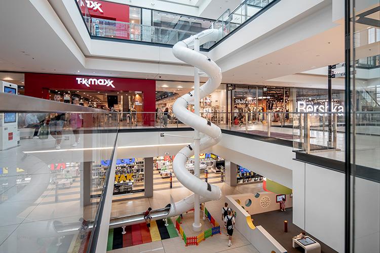 In addition to retail changes, Galeria Echo has introduced a new attraction: a 12-metre-high spiral slide linking levels +1 and -1. The installation functions both as a playful architectural feature and as an alternative route between floors, adding a distinct visual element to the centre’s interior.